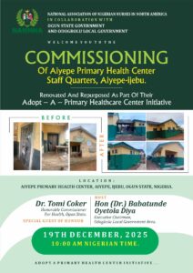 According to Dr. Esther OSHUNLUYI, Chairperson, NANNNA’s Health Mission Committee, and Coordinator of the Adopt-A-Primary Health Centre Initiative in Nigeria, the interventions are aimed at bringing healthcare services closer to underserved communities and providing succour to the less privileged. She noted that the Association’s work in Ogun State demonstrates the powerful impact of collaboration between diaspora professionals, state authorities, and local communities.