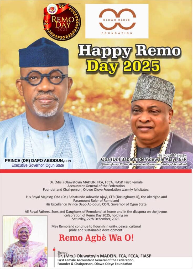 An illustrious indigene of Iperu Remo and the First Female Accountant-General of the Federation, Dr. (Mrs.) Oluwatoyin MADEIN, FCA, FCCA, FIASP, has sent her warmest felicitations and profound goodwill to the Akarigbo and Paramount Ruler of Remoland, His Royal Majesty, Alayeluwa Oba (Dr.) Babatunde Adewale AJAYI, CFR (Torungbuwa II), the Governor of Ogun State, His Excellency, Prince Dapo ABIODUN, CON, as well as to all Royal Fathers and sons and daughters of Remoland, at home and in the diaspora, on the celebration of Remo Day 2025, holding on Saturday, 27th December, 2025.