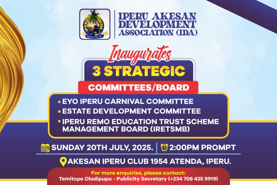 The Iperu-Akesan Development Association (IDA) will on Sunday, 20th July, 2025, perform the inauguration of two additional committees and a newly-reconstituted board.