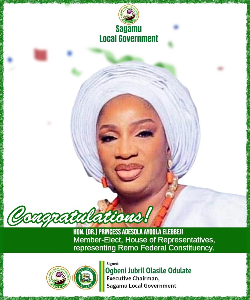 The Executive Chairman of Sagamu Local Government, Ogbeni Jubril Olasile Odulate, has congratulated Hon. (Dr.) Princess Adesola Ayoola Elegbeji on her victory in the Remo Federal Constituency bye-election.