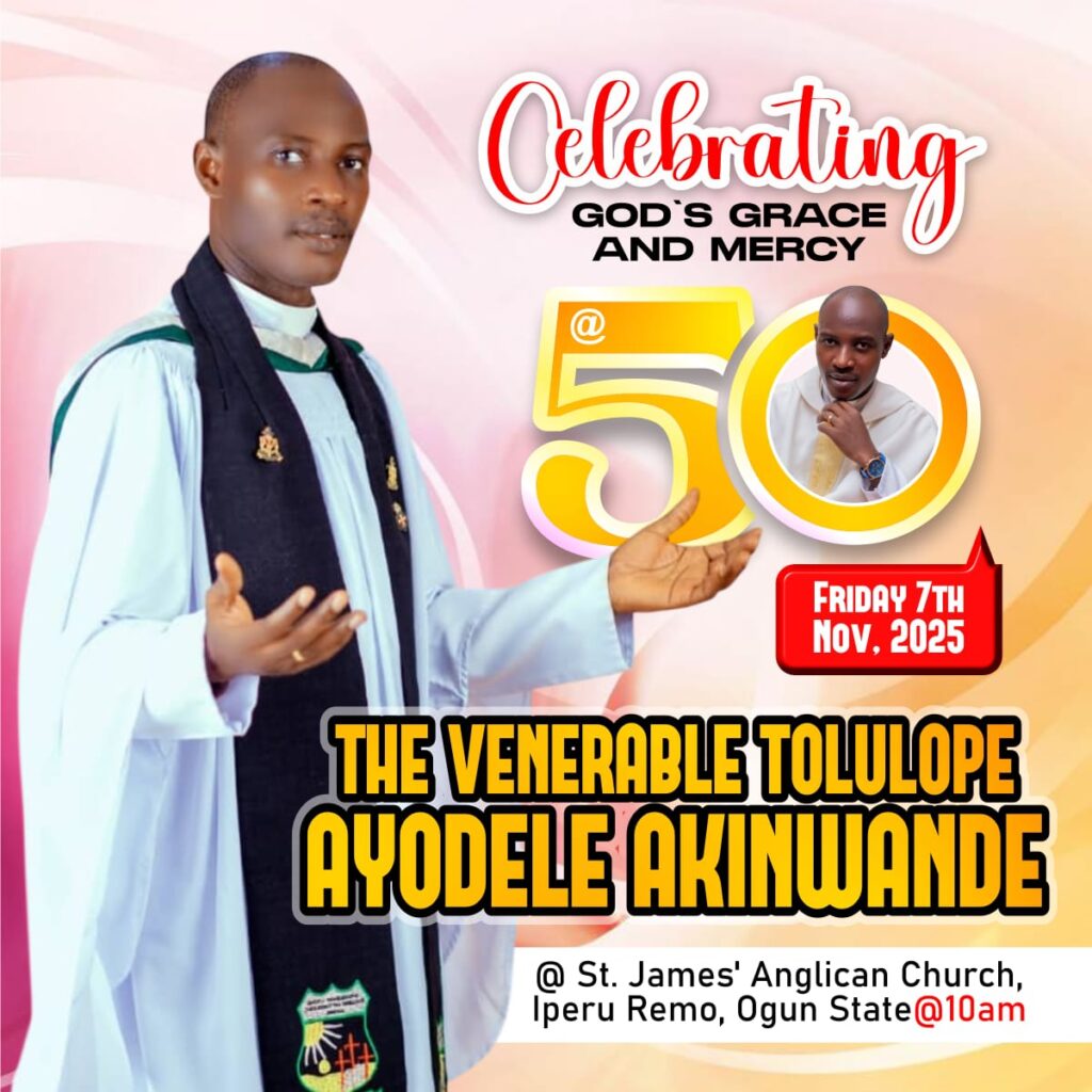 The Venerable Tolulope Ayodele AKINWANDE, the esteemed Archdeacon of Iperu Archdeaconry and Vicar of St. James’ Anglican Church, Iperu-Remo, will today 7th November, 2025, celebrate his 50th birthday with a profound Thanksgiving Service. The event, themed “Celebrating God’s Grace and Mercy at 50,” underscores a life dedicated to faith, service, and community transformation within the Anglican Communion.
